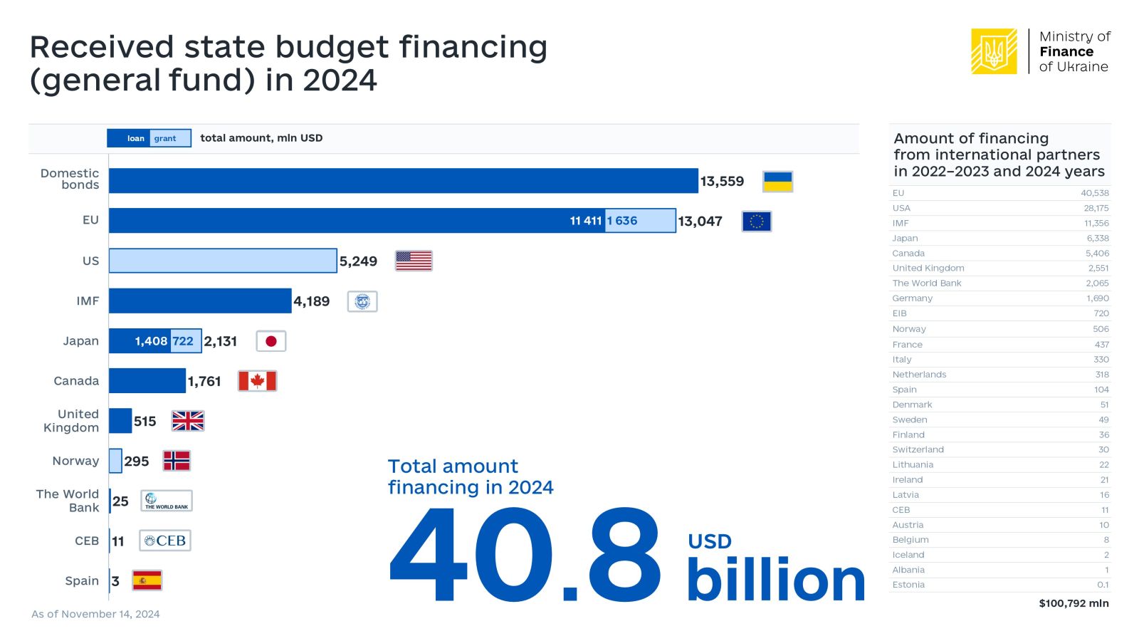 Ukraine received the most funds in the form of grants from the United States. The European Union is the second largest donor in terms of grant funds - USD 2.3 billion. Other countries that provided significant support on a non-refundable basis included Germany (USD 1.4 billion), Japan (USD 955 million), and Norway (USD 506 million).