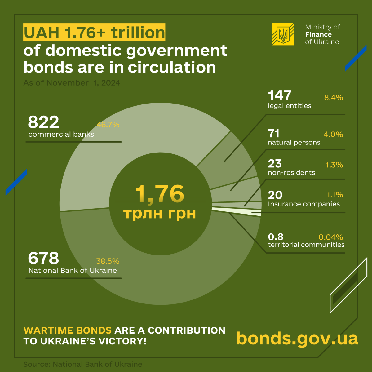 As of November 1, there were over UAH 1.76 trillion worth of domestic government bonds in circulation. The largest share is held by commercial banks (46.7%) and the National Bank (38.5%). The share of legal entities and individuals is 8.4% and 4.0%, respectively. The share of non-residents is 1.3%, insurance companies - 1.1%, and territorial communities - 0.04%.