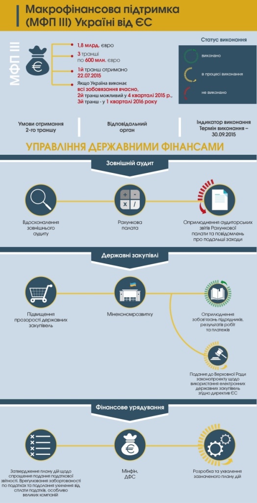 Но, кроме того, предоставление двух траншей ЕС также тесно связано с продвижением Украиной и других реформ, о которых не говорится в программах сотрудничества с МВФ и ВБ. Какие именно изменения необходимы для получения второго транша, кто за это отвечает и когда это должно быть сделано, мы в простой форме показали в инфографике ниже.