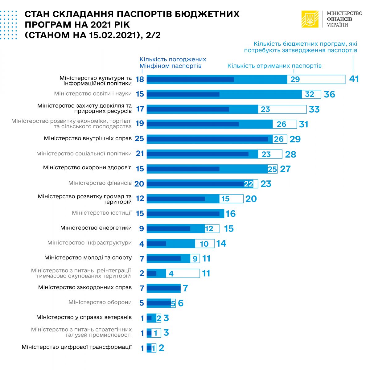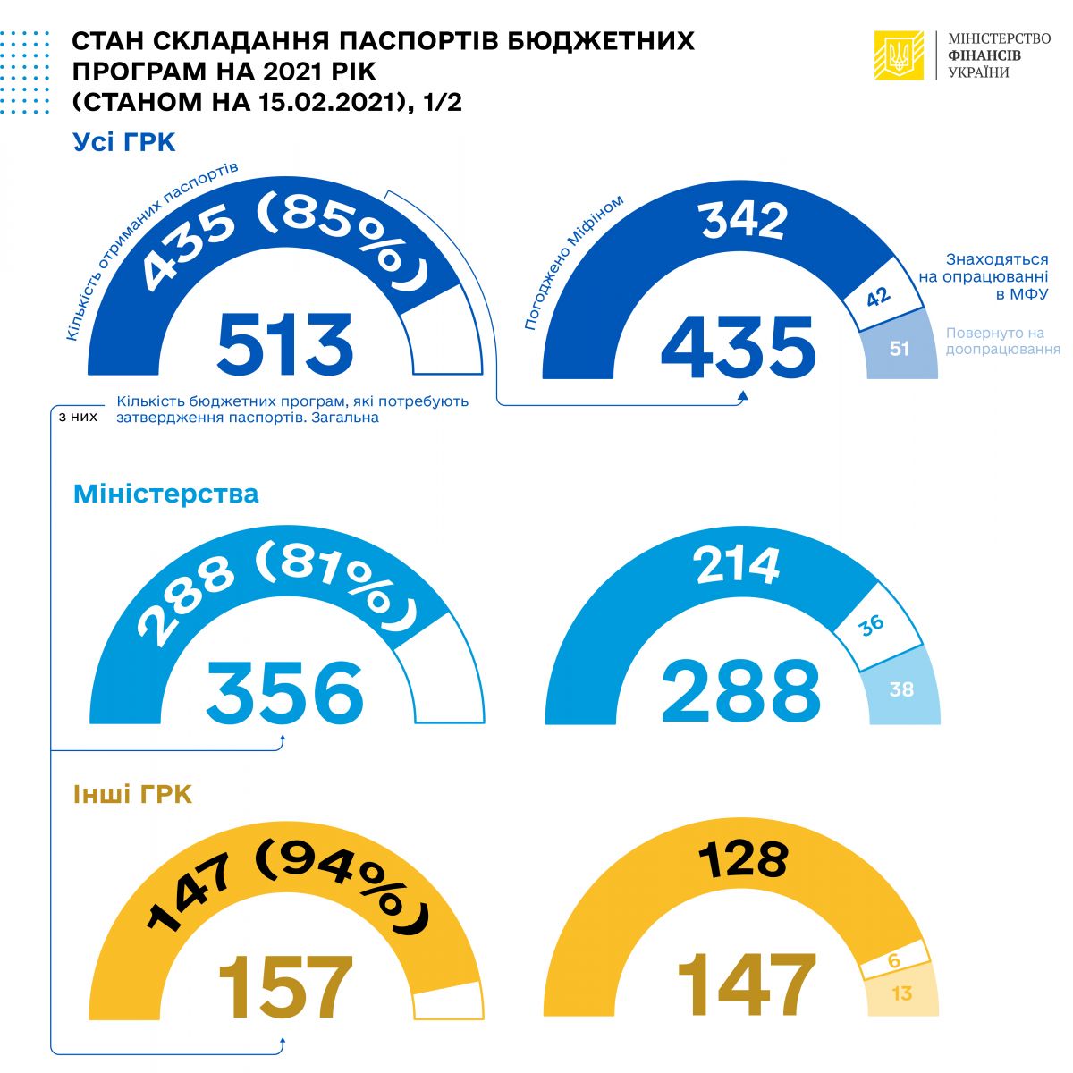 Станом на 15 лютого 2021 року із 513 бюджетних програм, що потребують затвердження у поточному році, до Мінфіну надійшло 435 паспортів бюджетних програм, з яких погоджено – 342 паспорти, повернуто на доопрацювання – 51 паспорт.