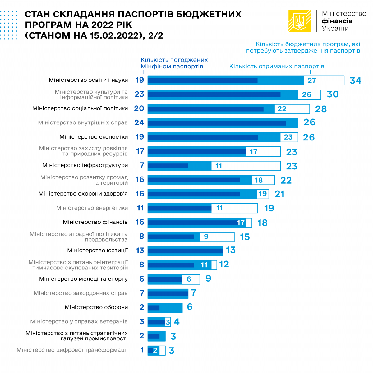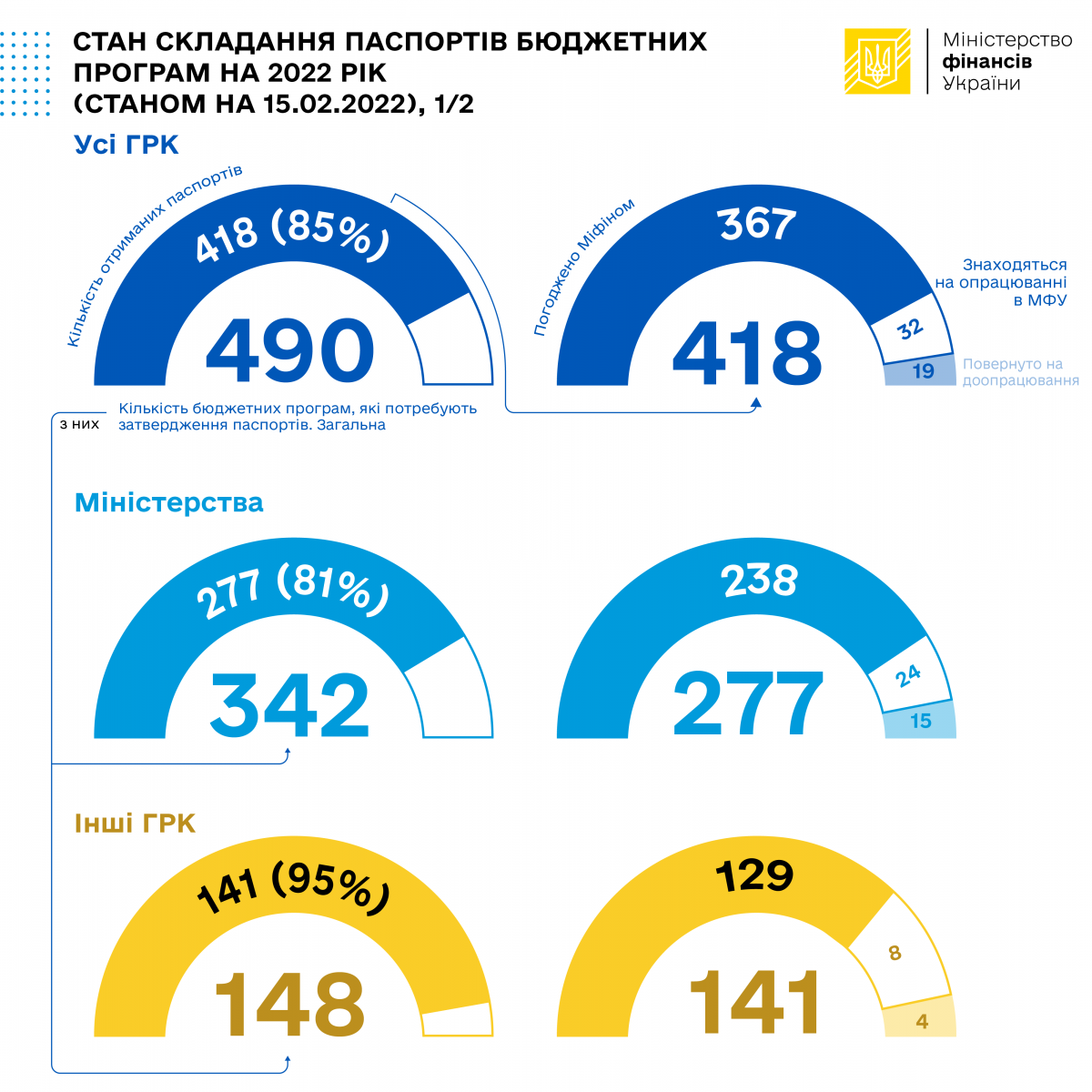 Так, станом на 15 лютого 2022 року із 490 бюджетних програм, що потребують затвердження паспортів у поточному році, до Мінфіну надійшло 418 паспортів бюджетних програм, з яких погоджено – 367 паспортів, повернуто на доопрацювання – 19 паспортів.