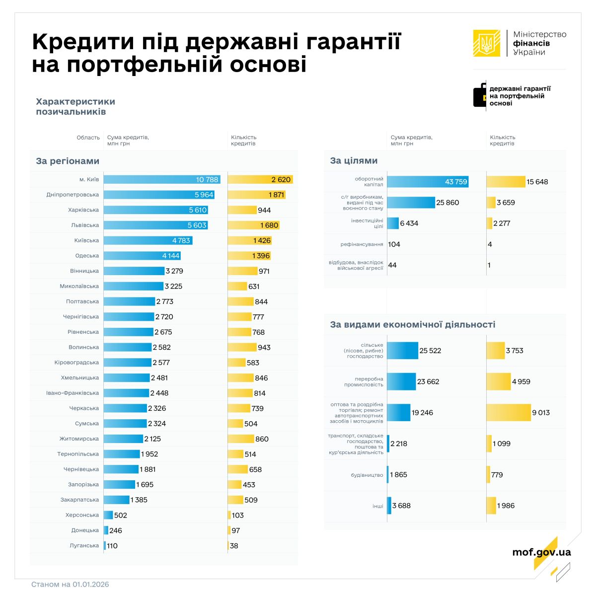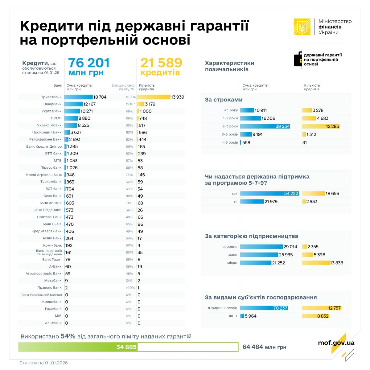 Станом на 1 січня 2026 року банки-кредитори обслуговують 21 589 кредитів на суму 76,2 млрд гривень. Зобов’язання за основним боргом, що частково забезпечені державними гарантіями на портфельній основі, становили 34,9 млрд гривень. Це 54 % від загального ліміту наданих гарантій (64,5 млрд гривень).