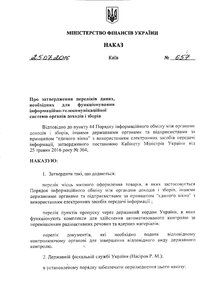 Останньою формальністю було затвердження Мінфіном переліку документів, які треба подати контролюючому органу для завершення відповідного виду державного контролю, перелік із 192 місць митного оформлення товарів, в яких буде застосовуватись система «єдиного вікна», а також 47 пунктів пропуску з автоматизованим контролем за переміщенням радіоактивних речовин та ядерних матеріалів. Завершення даних процедур дозволить запустити систему за графіком, тобто вже з 1 серпня.