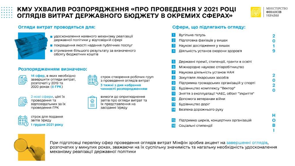 Цим рішенням Кабмін забезпечив завершення оглядів витрат державного бюджету, розпочатих у 2019 та 2020 роках та визначив дві нові сфери.