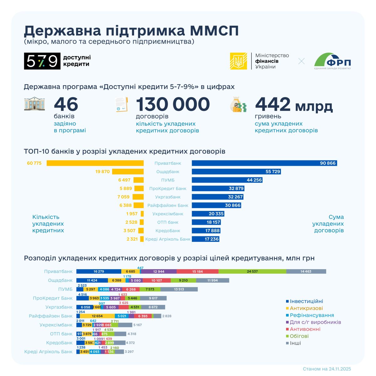 ФРП уклав угоди про співробітництво з 46 уповноваженими банками Програми. Держава продовжує здійснювати всі необхідні компенсаційні виплати на користь бізнесу за укладеними кредитними договорами у межах Програми.