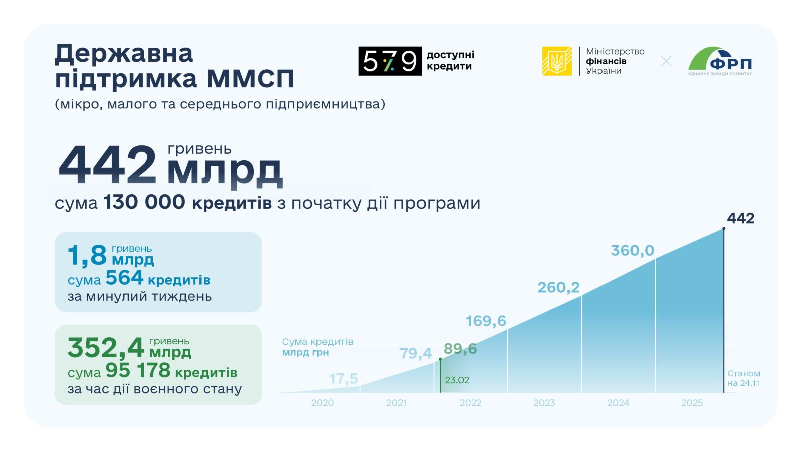 За час дії воєнного стану в Україні видано 95 178 кредитів на 352,4 млрд грн (у тому числі банками державного сектору – 69 589 кредитів на 178,7 млрд грн), з яких станом на 24 листопада поточного року: