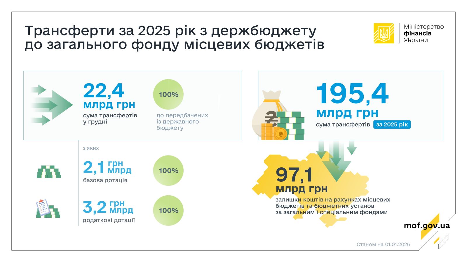 У грудні 2025 року Мінфін згідно з бюджетним законодавством забезпечив перерахування міжбюджетних трансфертів до загального фонду місцевих бюджетів в обсязі 22,4 млрд грн, що становить 100 % до передбачених із державного бюджету коштів на грудень, зокрема: