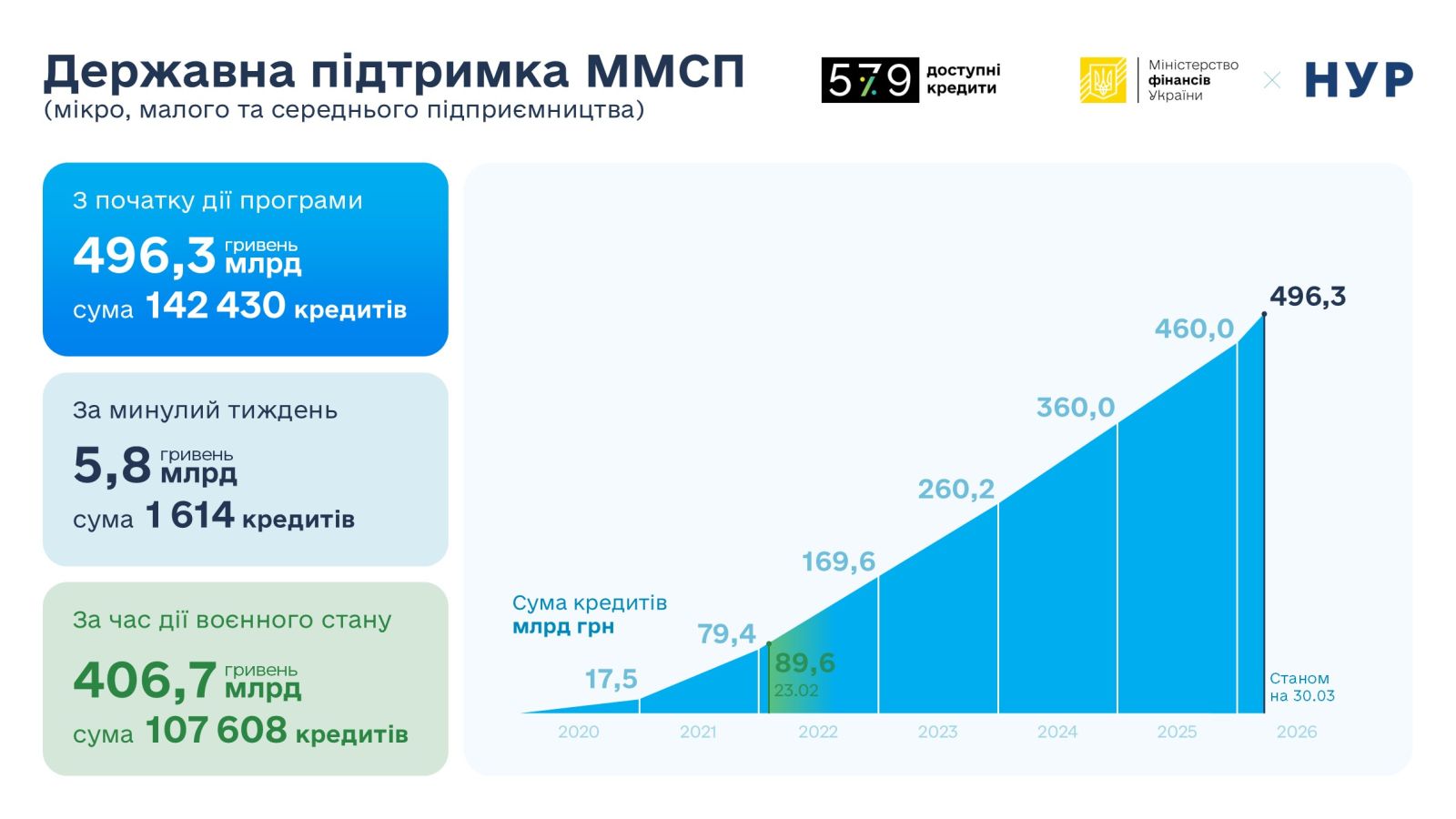 Усього з моменту старту Програми підписано 142 430 кредитних договорів на 496,3 млрд грн, з них банками державного сектору економіки – 97 632 договори на 226,2 млрд гривень.
