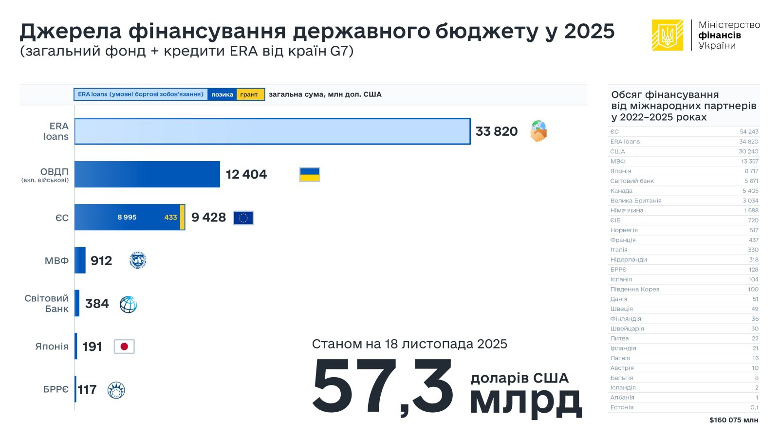 Джерелами фінансування державного бюджету є військові облігації, кредити від Міжнародних фінансових організацій, а також двосторонні кредити та гранти.