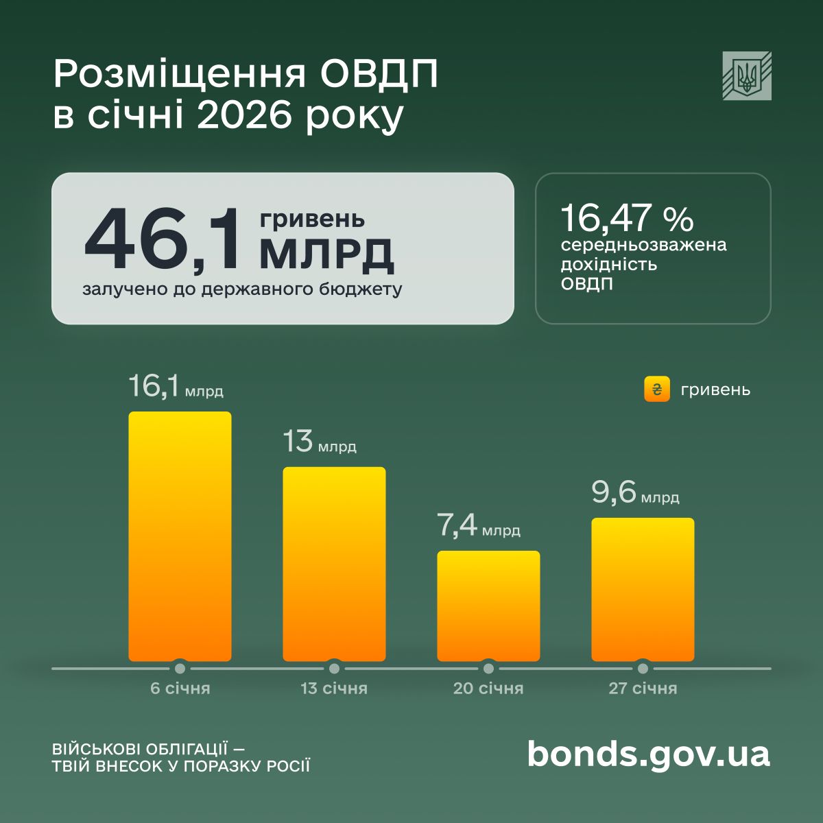 У січні Міністерство фінансів провело 14 аукціонів і залучило до державного бюджету 46,1 млрд грн. Середньозважена дохідність становила 16,47% річних.