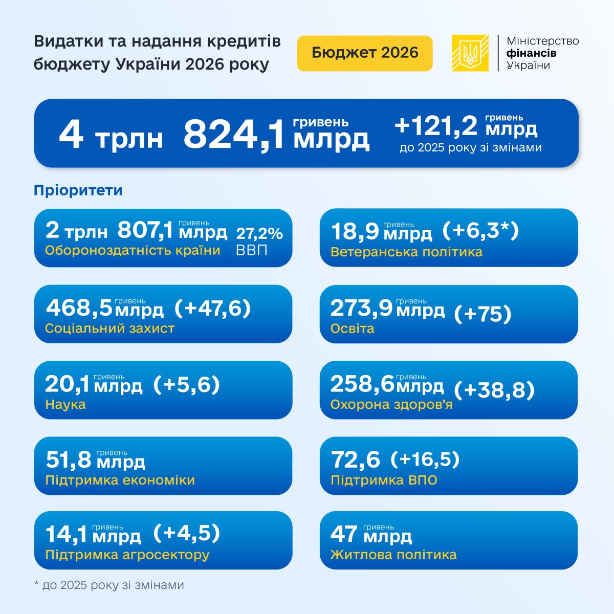 Видатки та надання кредитів із державного бюджету у 2026 році становитимуть 4 трлн 824,1 млрд грн, що на 121,2 млрд грн більше, ніж у 2025 році. Загальний фонд – 4 трлн 402,3 млрд грн, спеціальний фонд – 421,8 млрд грн.