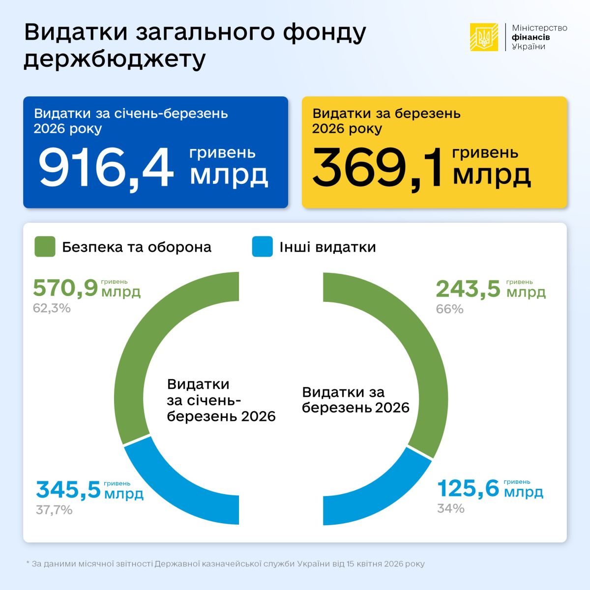 За інформацією Державної казначейської служби України загальна сума касових видатків загального фонду державного бюджету за січень – березень 2026 року становить 916,4 млрд грн, що на 60,4 млрд грн, або на 7,1% більше ніж за аналогічний період минулоріч. У березні видатки становили 369,1 млрд грн.