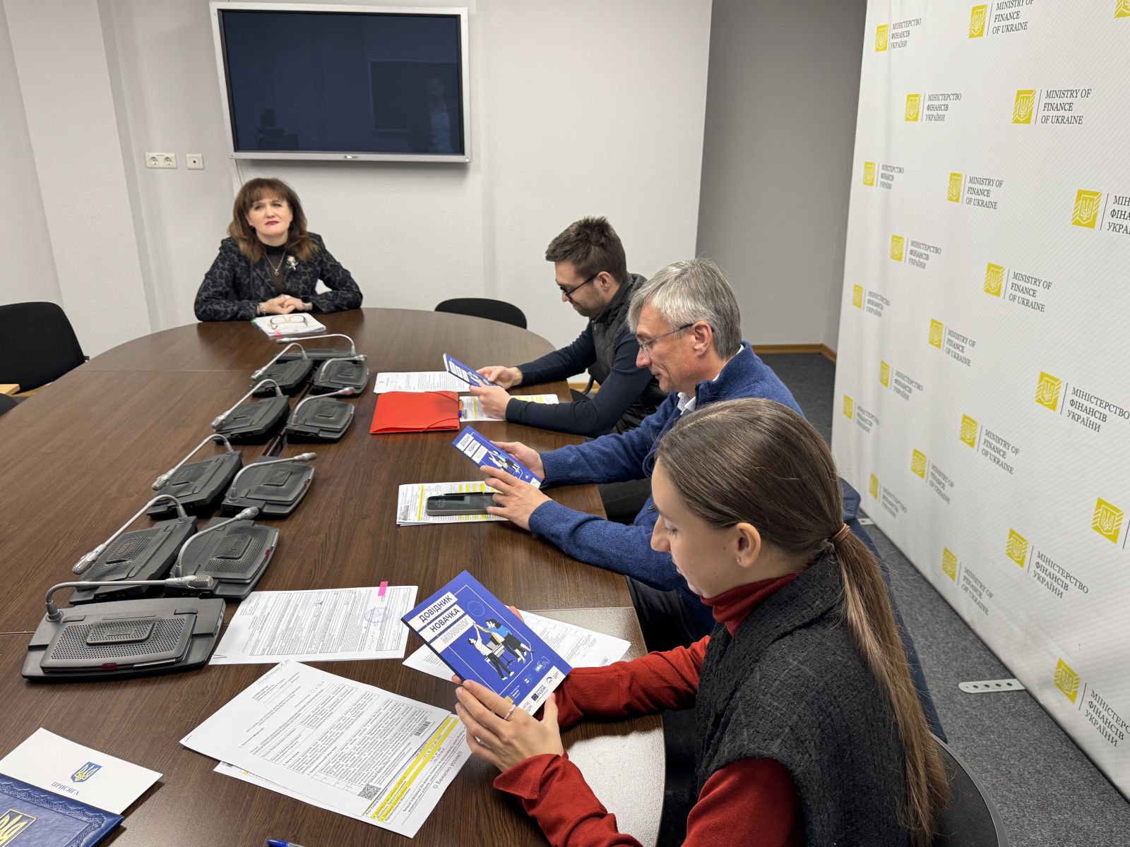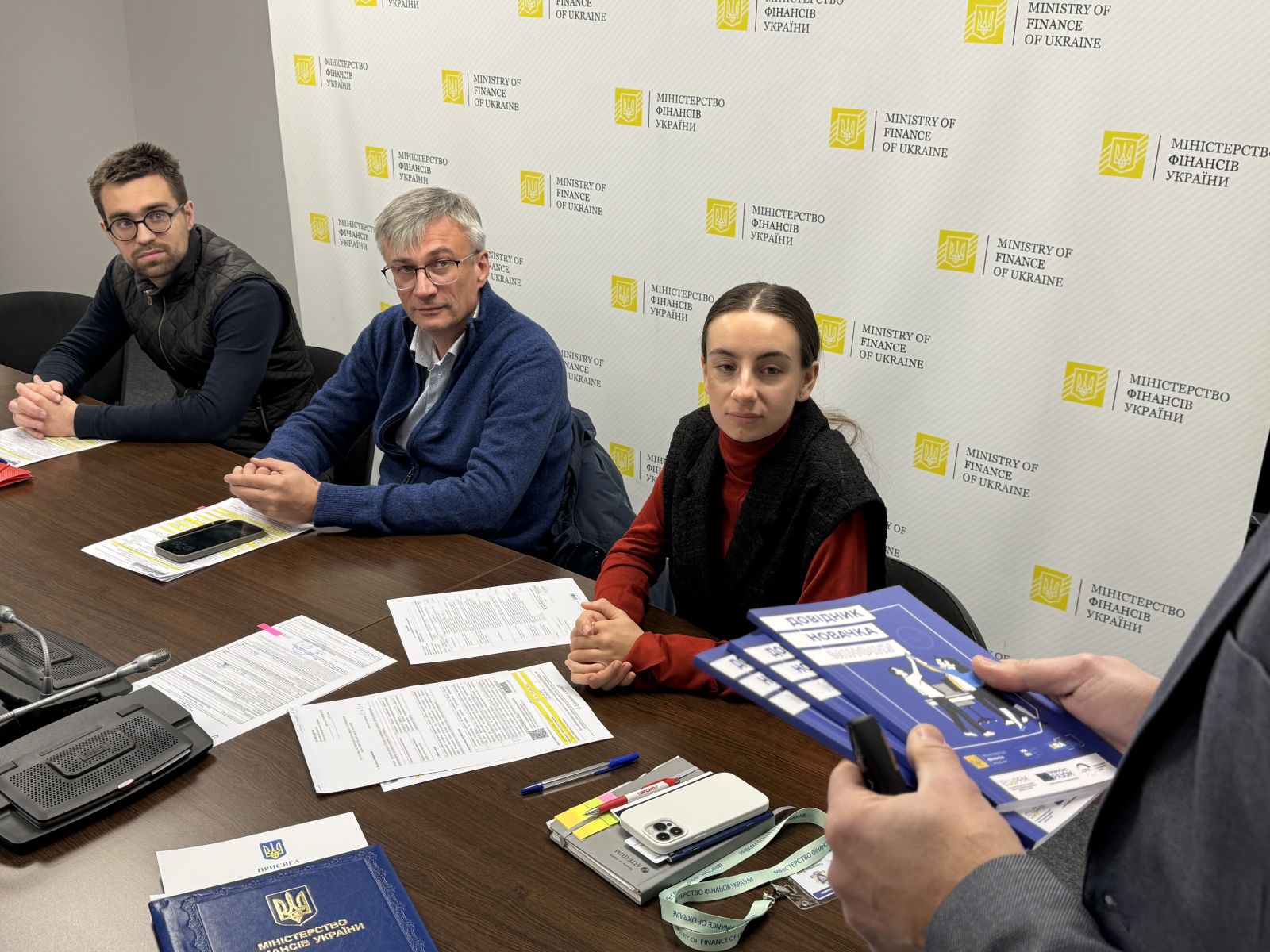 Вперше, в межах Welcome day, новим працівникам було вручено «Довідник новачка Мінфіну» – практичний посібник для нових працівників, розроблений за підтримки Проектного офісу реформ* при Міністерстві фінансів України та роздрукований за підтримки Програми EU4PFM. Довідник систематизує ключову інформацію про Мінфін, його функції та цілі, корпоративну культуру, правила етичної поведінки, антикорупційні стандарти, внутрішні процедури, можливості професійного розвитку та вимоги до безпеки. Видання допомагає новим членам команди швидше адаптуватися, зрозуміти очікування роботодавця та ефективно розпочати роботу в Міністерстві.