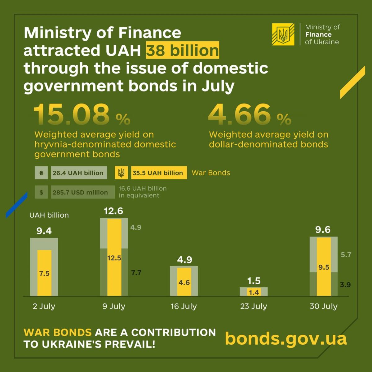 UAH 35.5 billion of the total amount of domestic government bonds placed in July were War Bonds. The funds raised are used to ensure the stable funding of the state's financial needs under martial law.