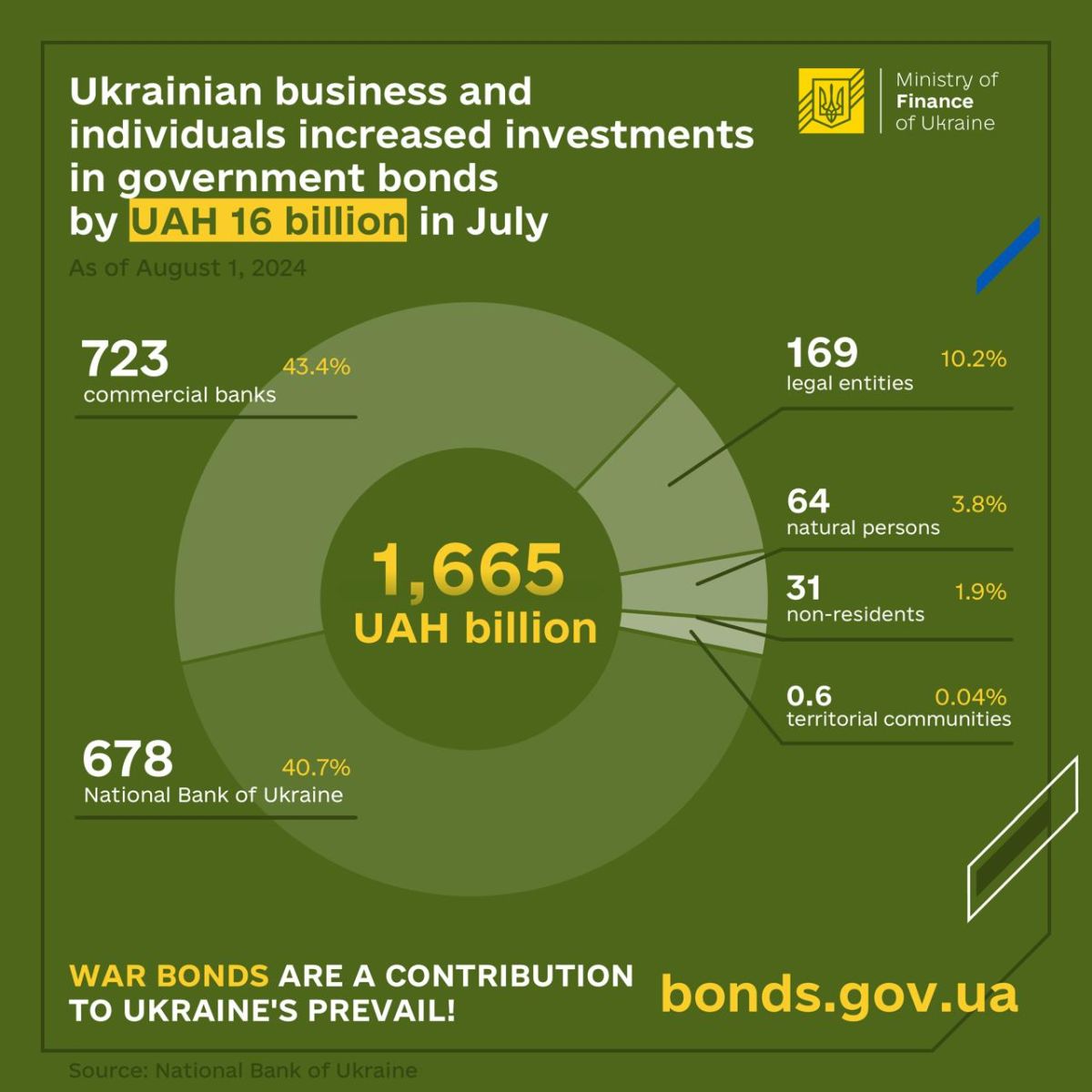 Ukrainian business and individuals increased investments in domestic government bonds by UAH 16 billion in July