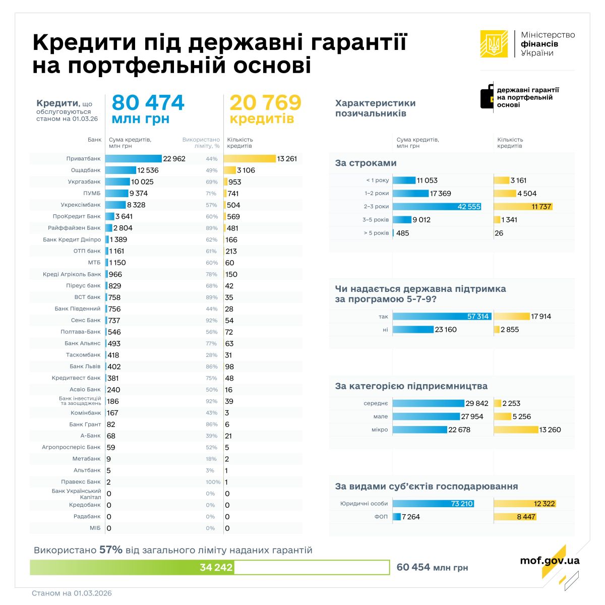 Станом на 1 березня 2026 року 29 банків-кредиторів обслуговують 20 769 кредитів на суму 80,5 млрд гривень. Зобов’язання за основним боргом, що частково забезпечені державними гарантіями на портфельній основі, становили 34,2 млрд гривень. Це 57 % від загального ліміту чинних гарантій (60,5 млрд гривень).