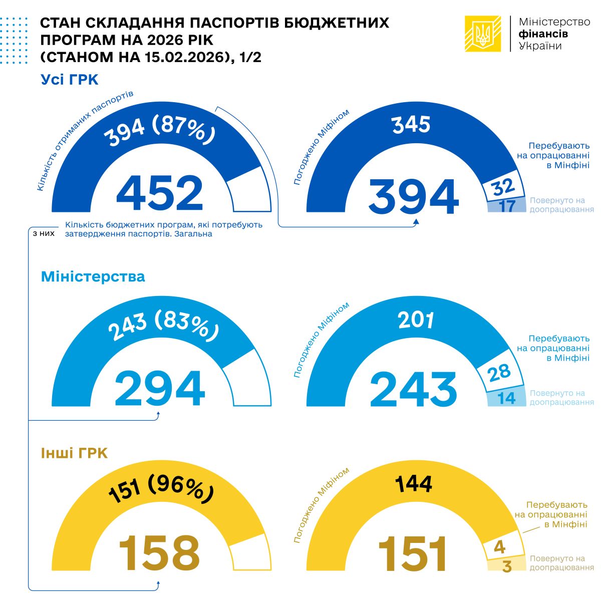 Станом на 15 лютого 2026 року із 452 бюджетних програм, що потребують затвердження паспортів у поточному році, до Мінфіну надійшло 394 паспорти бюджетних програм, з яких погоджено – 345 паспортів, повернуто на доопрацювання – 17 паспортів.