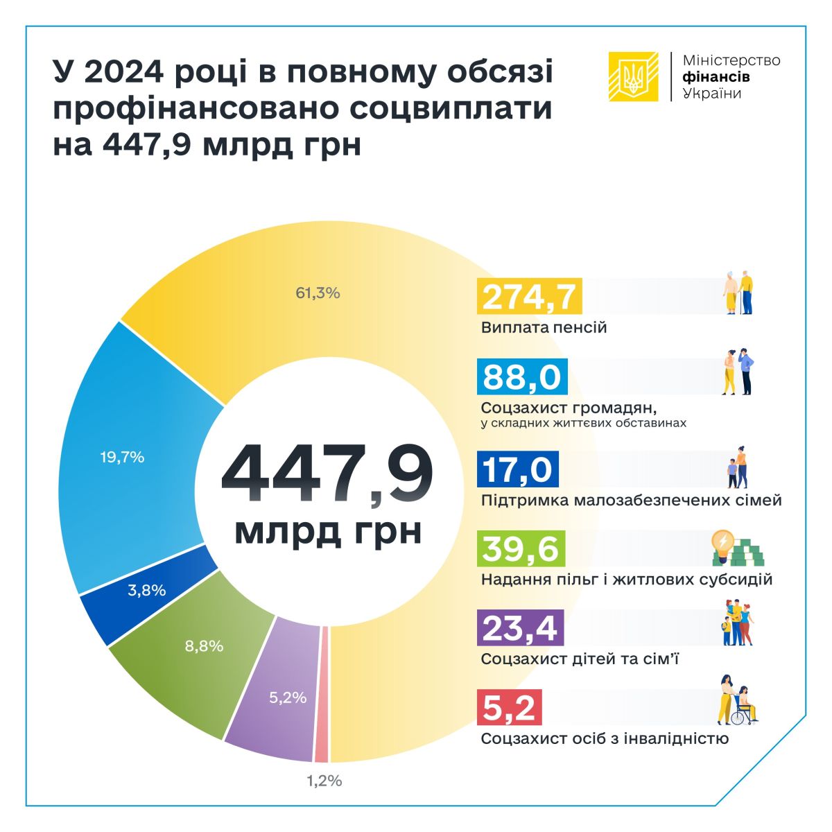 Міністерство фінансів вчасно та у повному обсязі профінансувало соцвиплати за 2024 рік. Так, минулого року із держбюджету на соцвиплати, які забезпечують Мінсоцполітики, було спрямовано 447,9 млрд гривень.