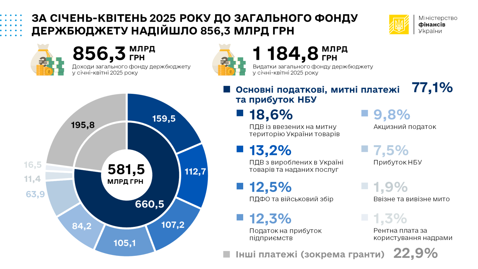 У цілому, за підсумками січня - квітня 2025 року, до загального і спеціального фондів державного бюджету надійшло 1 262,4 млрд грн податків, зборів та інших платежів. Касові видатки державного бюджету за цей період становили 1 550,4 млрд грн, у тому числі видатки загального фонду – 1 184,8 млрд гривень.