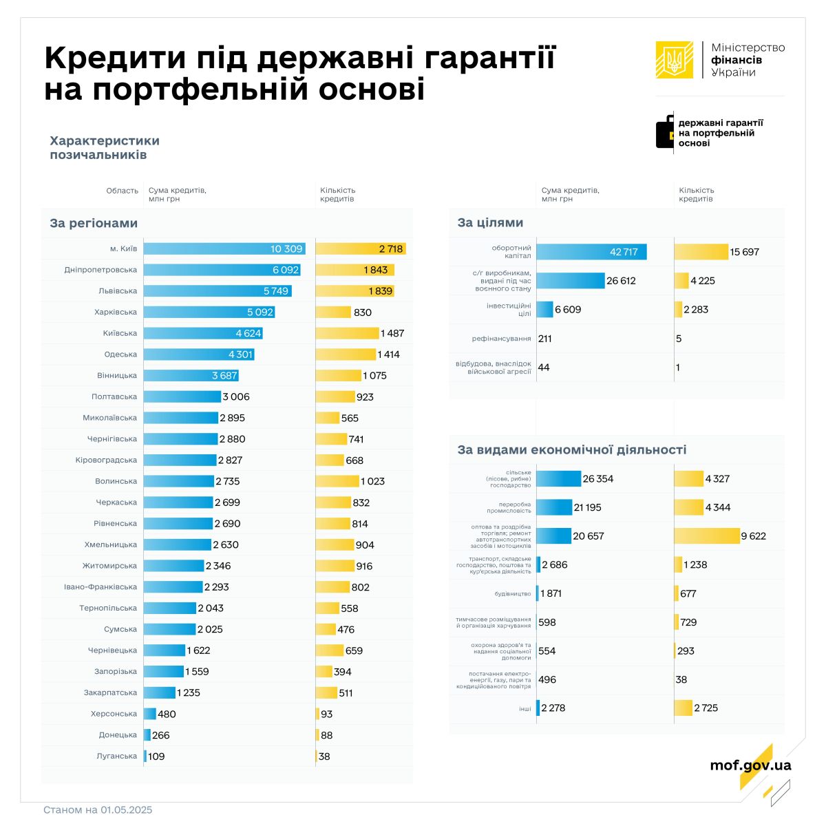 Станом на 1 травня 2025 року 31 банк-кредитор обслуговує 22 211 кредитів на 76,2 млрд гривень. Зобов’язання за основним боргом, що частково забезпечені державними гарантіями на портфельній основі, становили близько 34,3 млрд гривень. Це 66 % від загального ліміту наданих гарантій (51,7 млрд гривень).