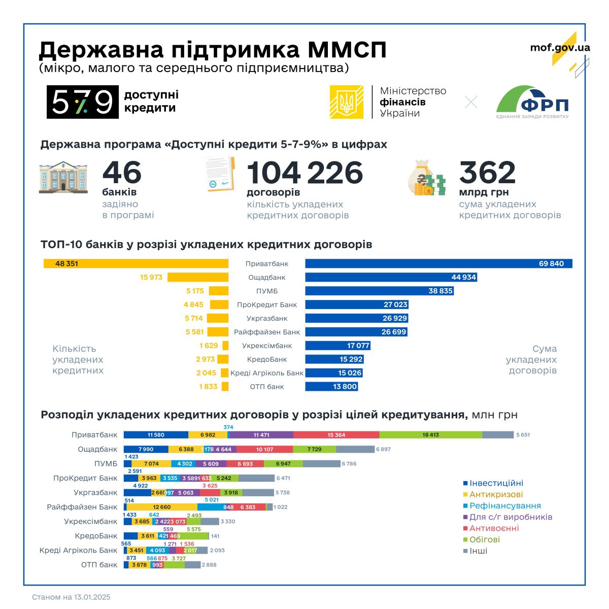 За час дії воєнного стану в Україні у межах «5-7-9%» видано 69 404 пільгові кредити на 272,4 млрд грн (у тому числі банками державного сектору – 51 433 кредити на 136,6 млрд грн). З них станом на 13 січня поточного року: