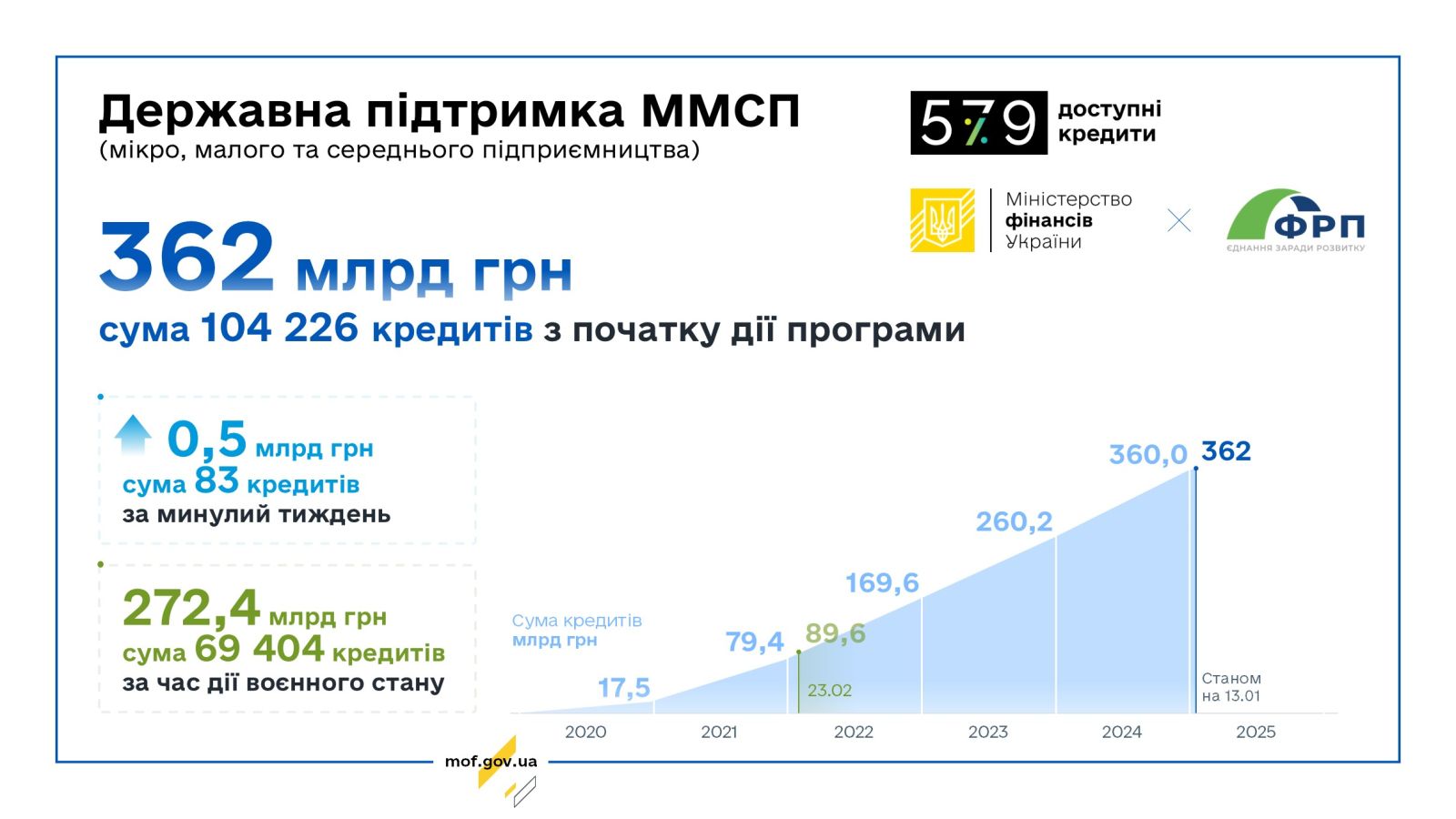 З початку 2025 року за Державною програмою «Доступні кредити 5-7-9%» підприємці отримали 516 пільгових кредитів на загальну суму 2 млрд грн, з яких від банків державного сектору економіки – 318 кредитів на 0,97 млрд гривень. Зокрема, за минулий тиждень уповноважені банки Програми видали 83 кредити на понад 0,5 млрд грн, з яких 39 кредитів видали держбанки на близько 0,3 млрд гривень.
