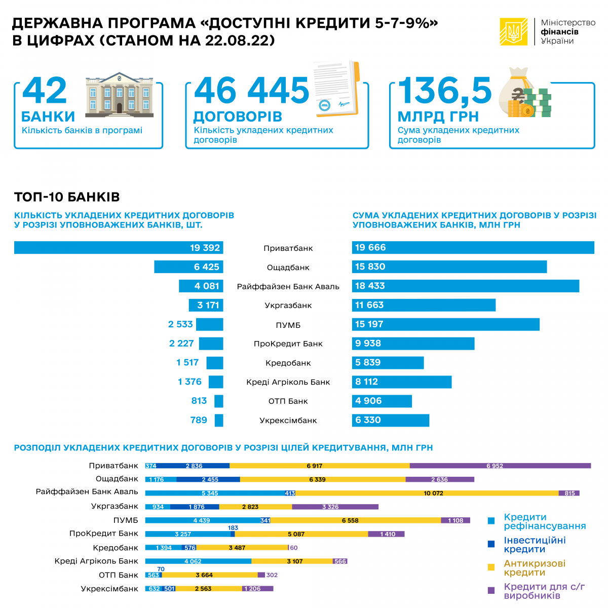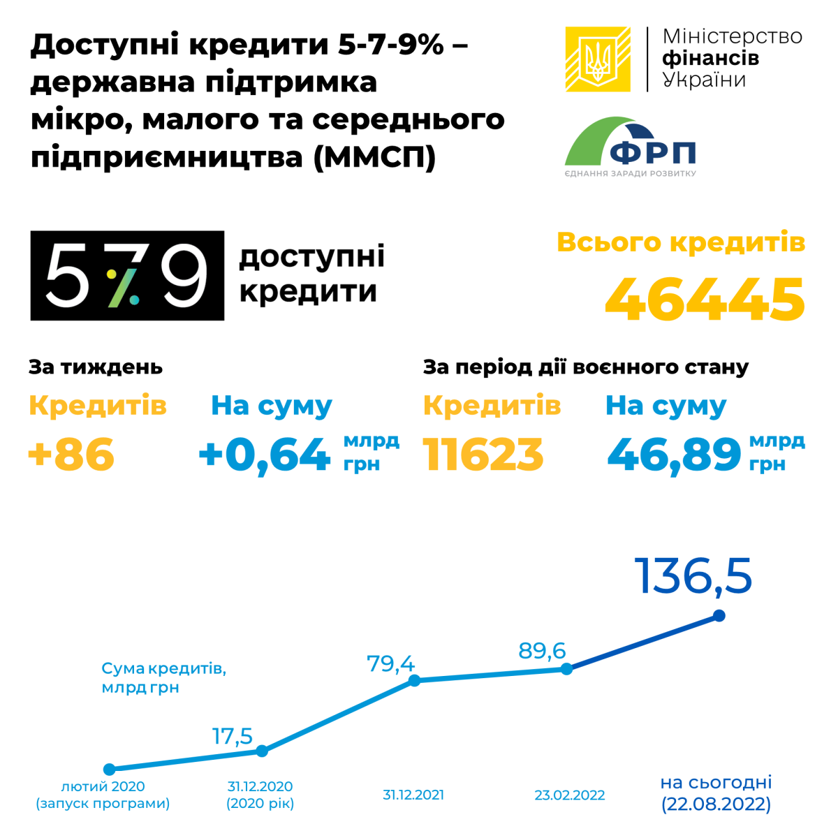 Усього з моменту старту Програми суб’єкти підприємництва станом на 22.08.2022 отримали від уповноважених банків 46 445 кредити на загальну суму 136,51 млрд грн, з яких 29 777 – від банків державного сектору економіки на загальну суму 53,49 млрд гривень.