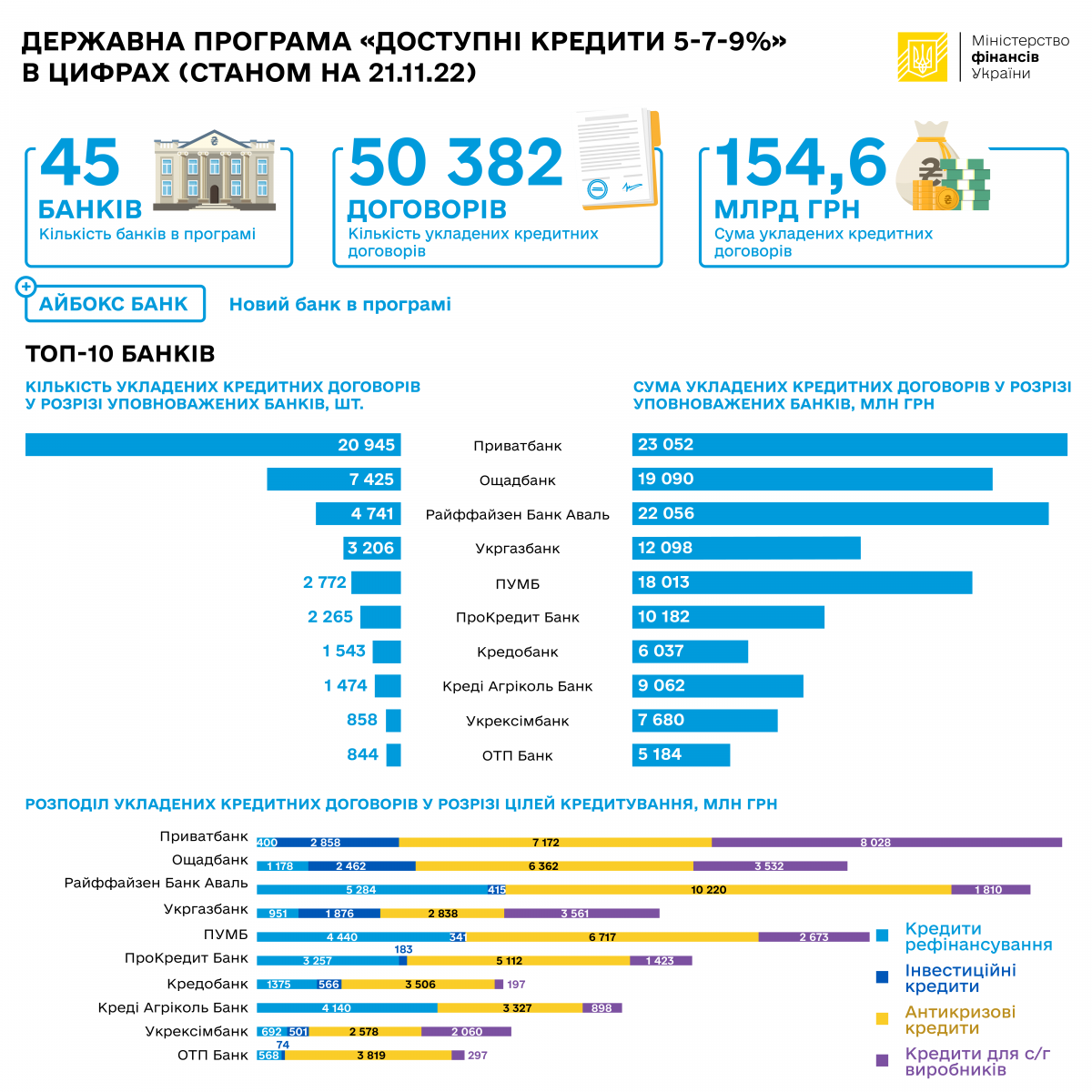 З моменту старту Державної програми «Доступні кредити 5-7-9%» суб’єкти підприємництва отримали від уповноважених банків 50 382 кредити на загальну суму 154,6 млрд грн, з яких 32 434 – від банків державного сектору економіки на загальну суму 61, 92 млрд гривень (станом на 21.11.2022 р.).