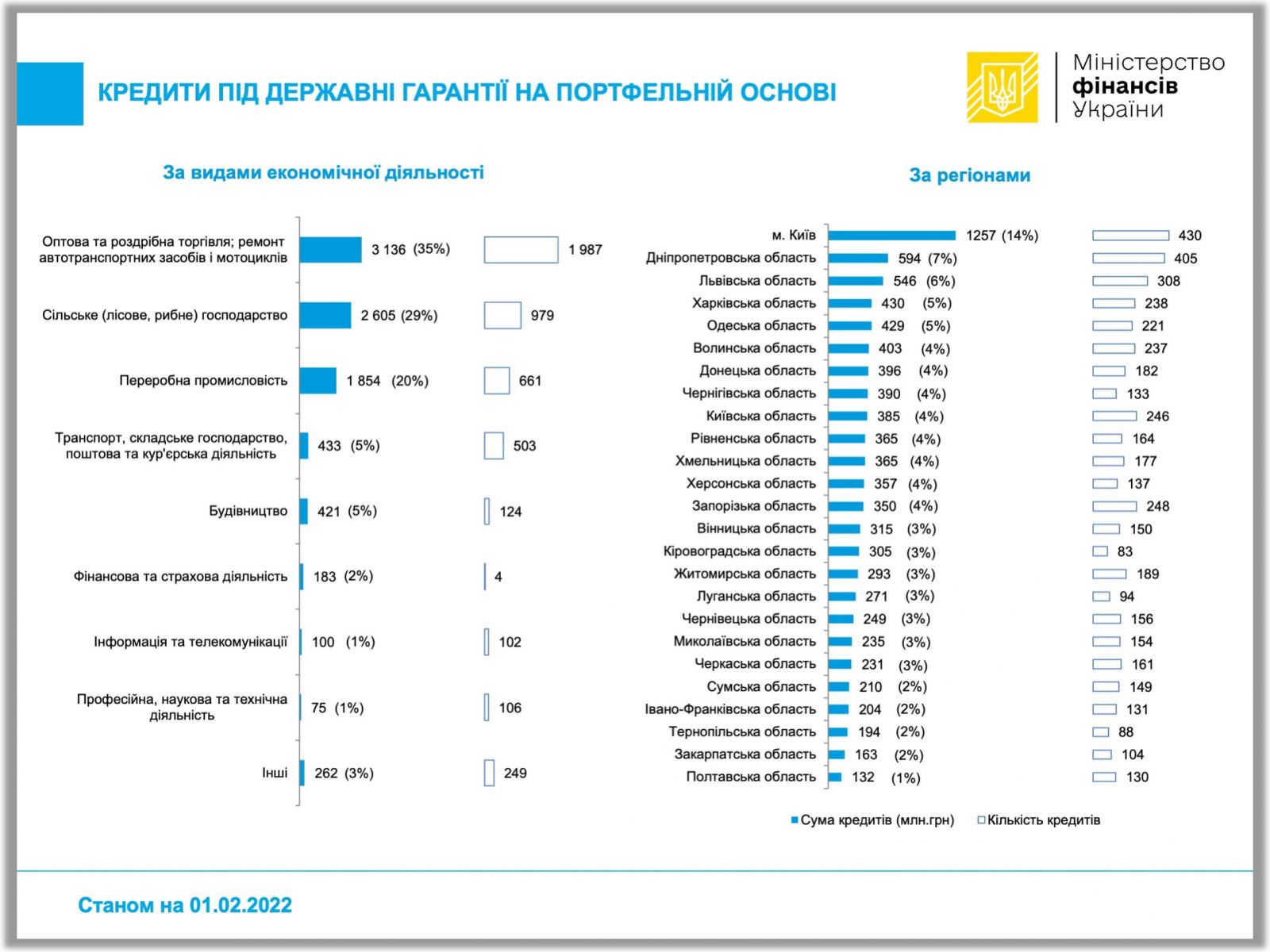 У рамках підтримки мікро, малого та середнього бізнесу в Україні через інструмент державних гарантій на портфельній основі станом на 01.02.2022 одинадцятьма банками надано 4715 кредитів на загальну суму 9,070 млрд гривень. Зобов’язання за основним боргом, що частково забезпечений державними гарантіями на портфельній основі, становили 3,950 млрд гривень. Це близько 33% від загального ліміту наданих гарантій (12,014 млрд гривень).