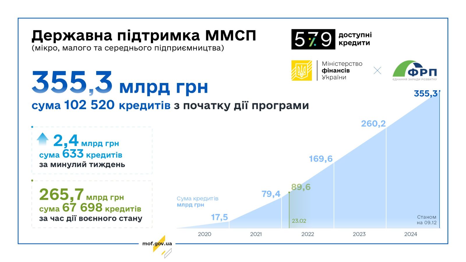 За Державною програмою «Доступні кредити 5-7-9%» ФРП уклав угоди про співробітництво з 46 банками. Держава продовжує здійснювати всі необхідні компенсаційні виплати на користь бізнесу за укладеними кредитними договорами у межах Програми.