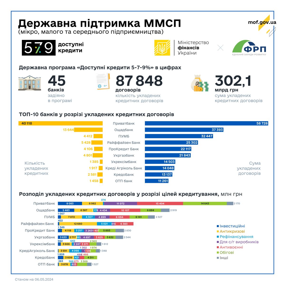 Усього з моменту старту Програми підписано 87 848 кредитних договорів на 302,1 млрд грн, з них банками державного сектору економіки – 60 046 договорів на 134,6 млрд гривень.