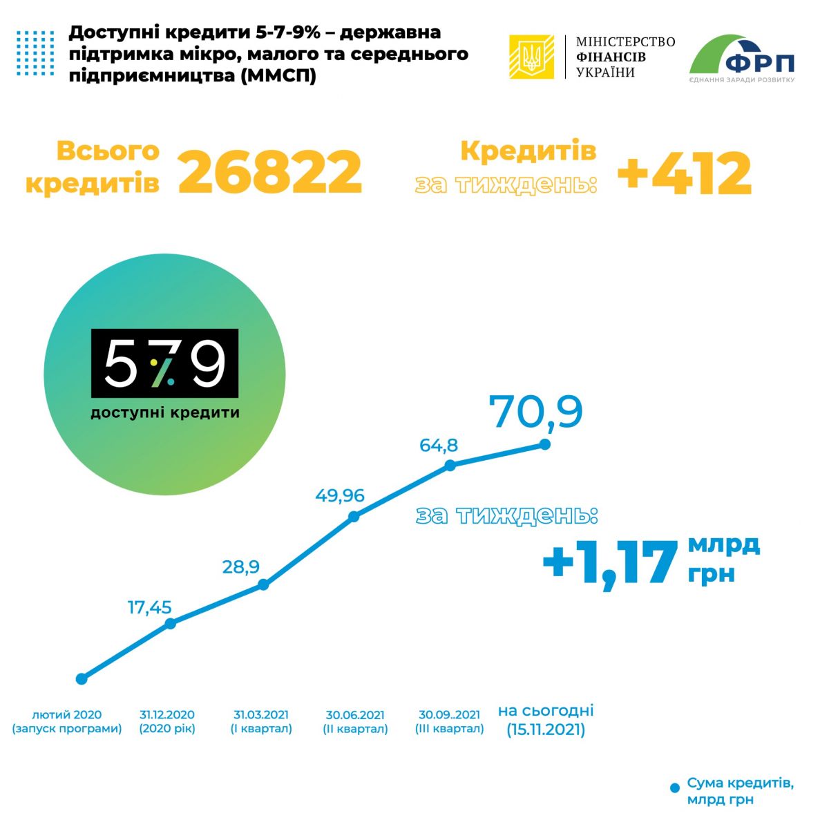 Всього ж з моменту старту «5-7-9%» представники мікро, малого та середнього підприємництва (ММСП) отримали від уповноважених банків 26 822 кредитів на суму 70,9 млрд грн.