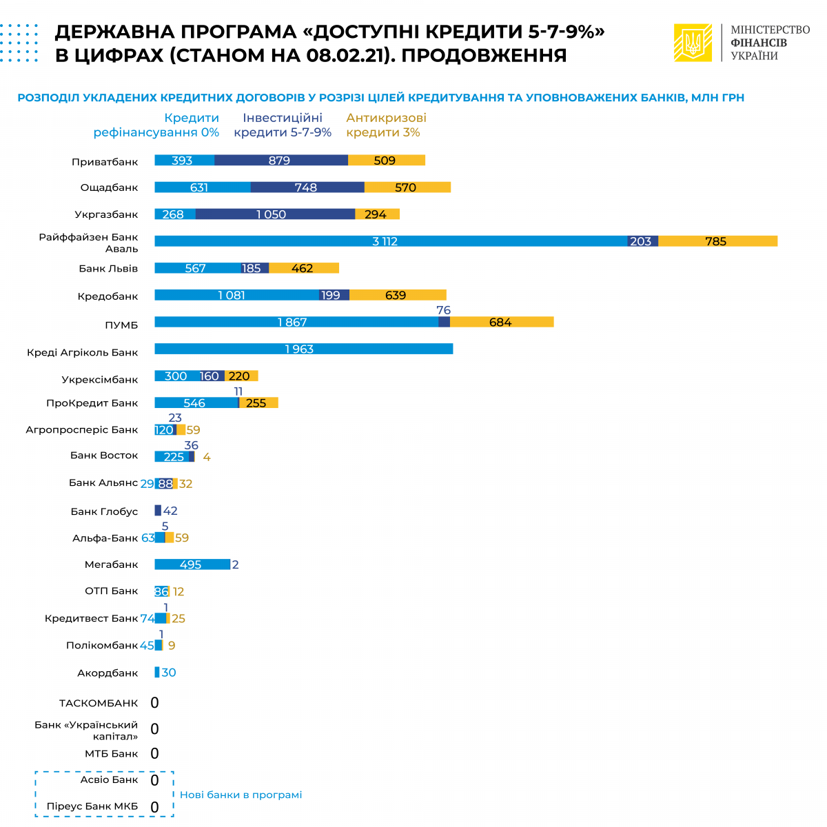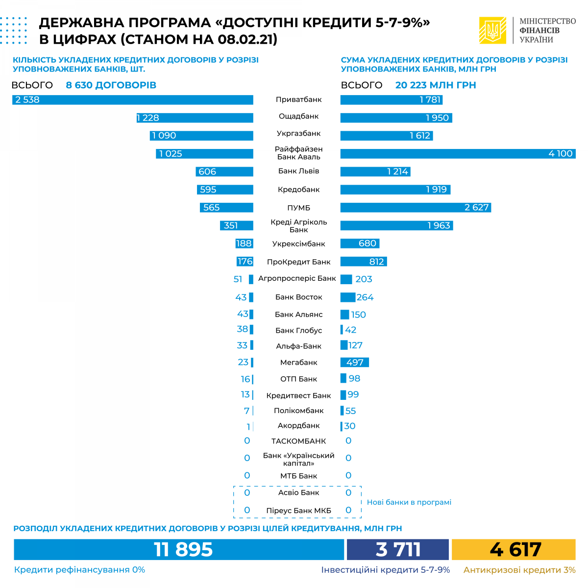 Від моменту старту Програми «Доступні кредити 5-7-9%» уповноважені банки вже видали 8630 позик на загальну суму в 20,2 мільярда гривень. З них 11,894 мільярда гривень були видані в якості рефінансування попередньо отриманих позик, 3,711 мільярда підприємці отримали на капітальні інвестиції та 4,617 мільярда гривень в якості антикризових кредитів під 3%.