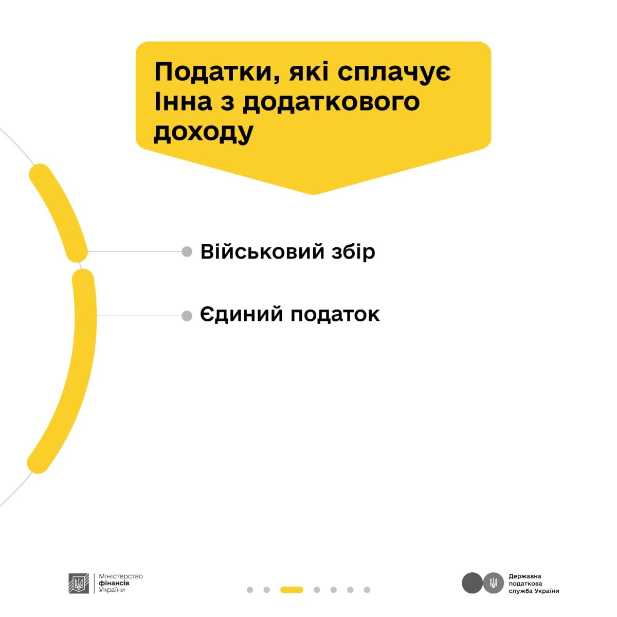 Раз на рік Інна подає податкову декларацію через Електронний кабінет платника податків на вебпорталі ДПС. Також щомісяця вона сплачує військовий збір та єдиний податок. Єдиний соціальний внесок з доходу від здачі квартири в оренду Інна не сплачує, бо цей податок вираховується з її офіційної зарплати вчительки роботодавцем.