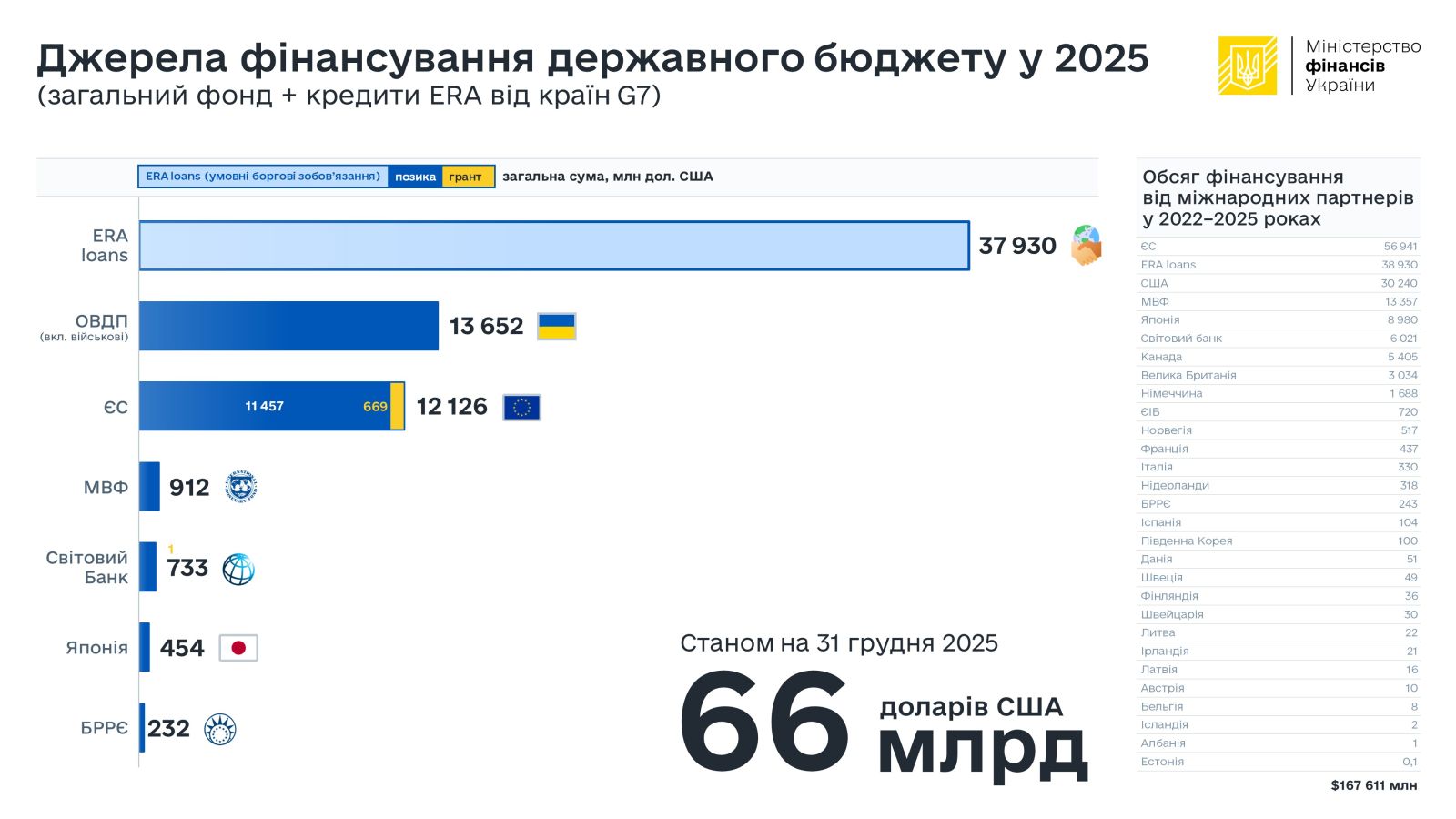 Джерелами фінансування державного бюджету є військові облігації, кредити від Міжнародних фінансових організацій, а також двосторонні кредити та гранти.