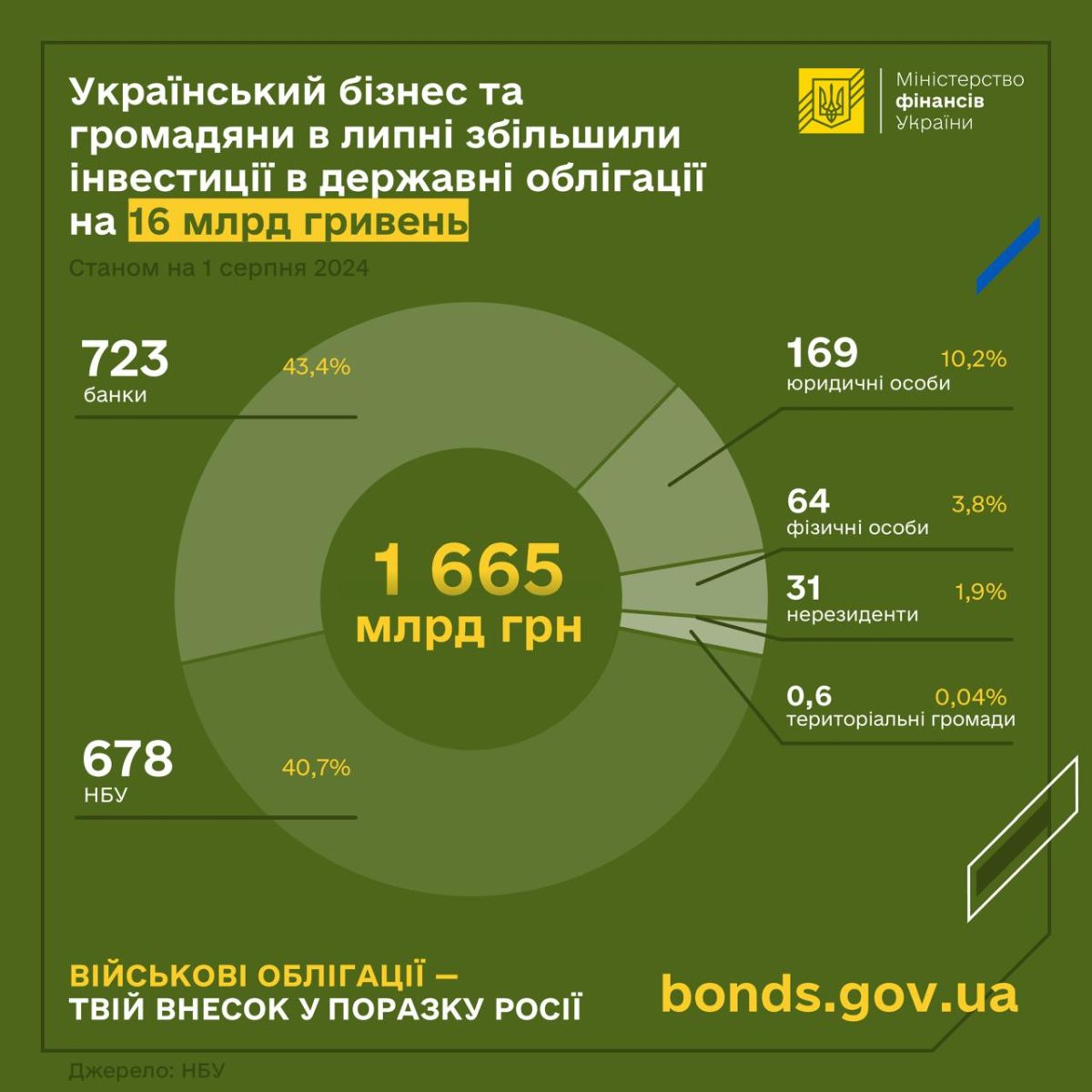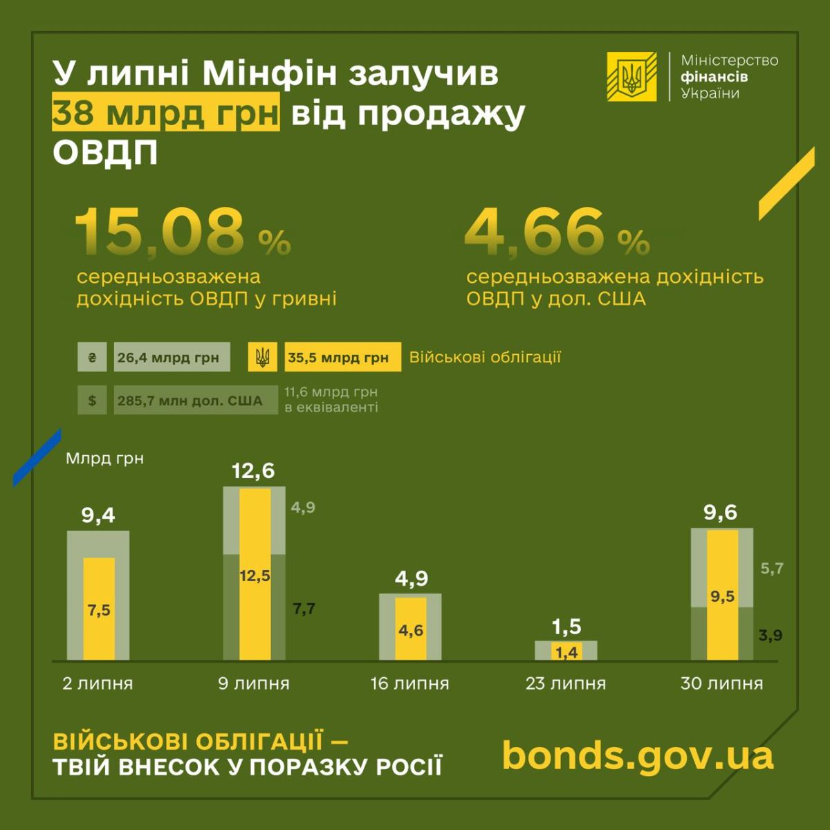У липні 2024 року Міністерство фінансів України залучило від випуску державних облігацій 38 млрд грн в еквіваленті — 26,4 млрд грн та 285,7 млн доларів США.